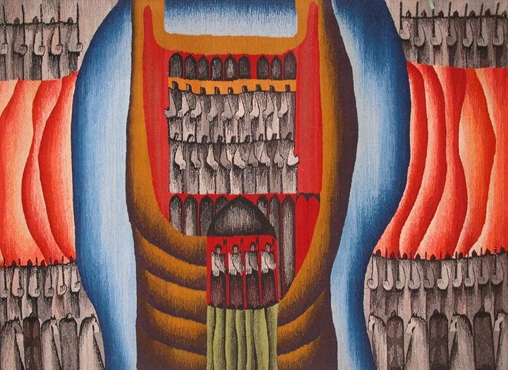 Elina Juopperi Inheritance is a work in progress. The audience can bring traditional raanu textiles and the artist will integrate them into the work, adding the donor's name to the piece. (Raanu weavings use a cotton warp and a wool weft.)